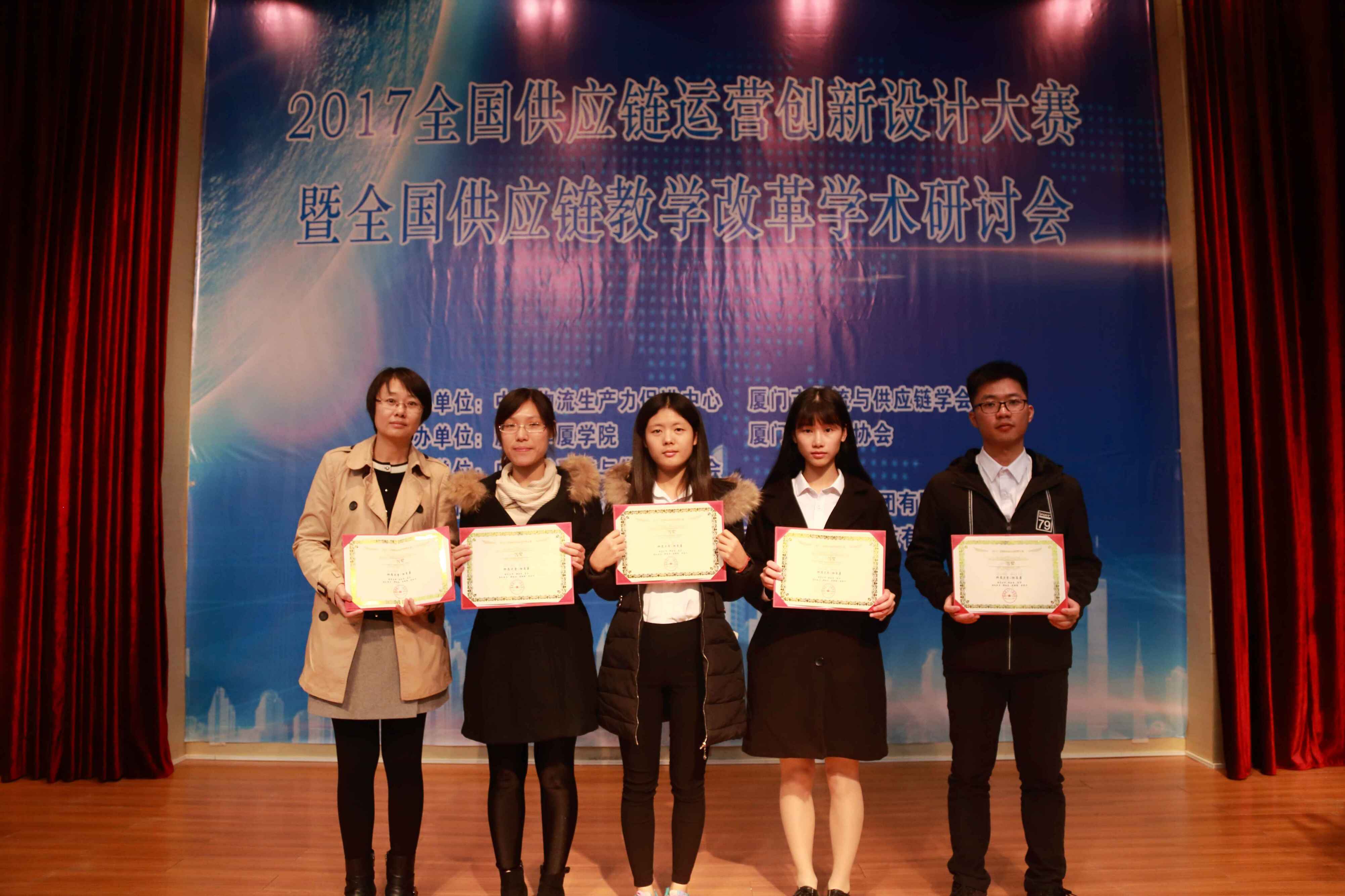 近日,由中国物流生产力促进中心、厦门市物流与供应链学会共同主办的2017全国供应链运营管理大赛在厦门市成功举办,Beat365官网由李征、郑雪清老师以及郑幼萍、曾丽娟、梁承洲同学组成的物流管理系独角兽团队从全国215所院校比赛队伍中脱颖而出,获得网赛一等奖。