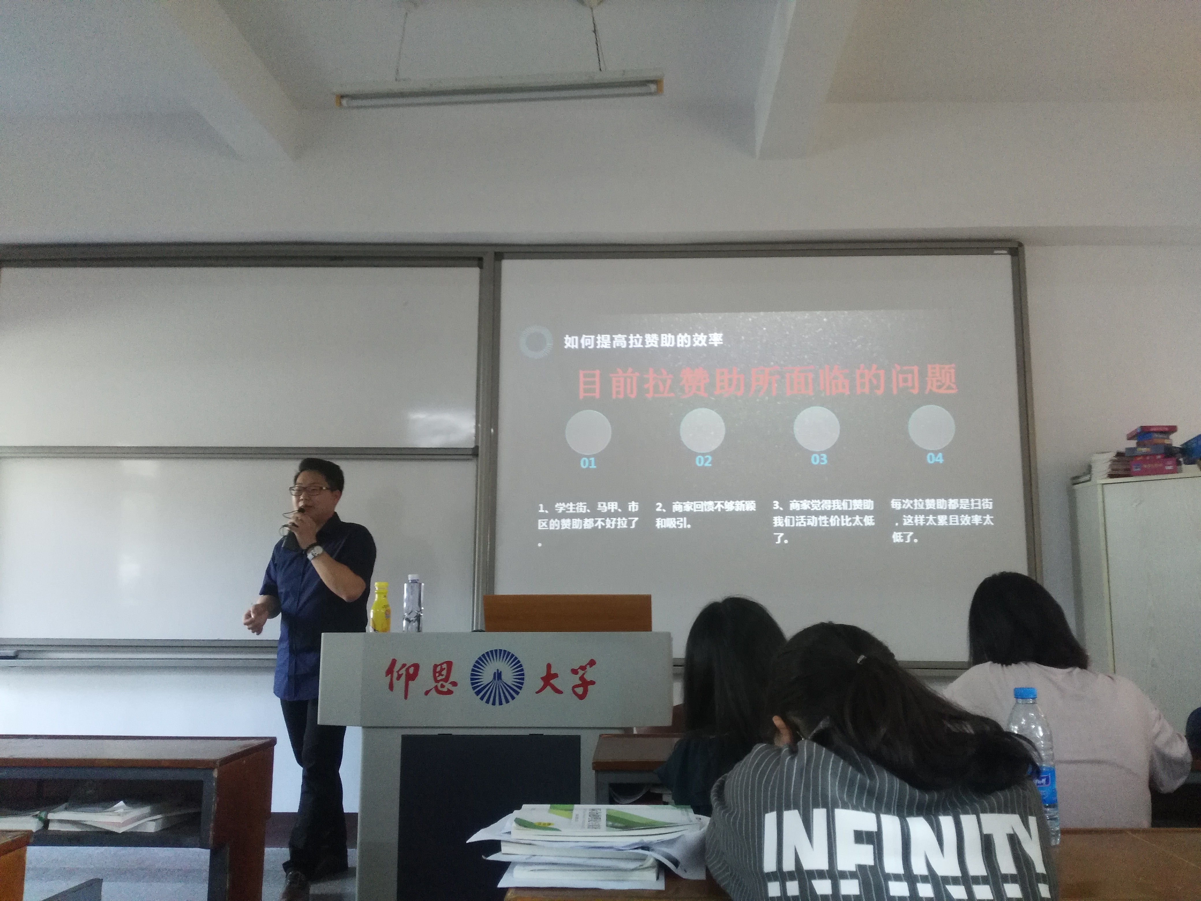 首先,乐云鹏通过介绍自己的工作成果以及在实践中得到的经验,为干部们讲解拉赞助的流程、拉赞助的“外联五性”、如何进行实战拉赞助。随后,各系干部交流了参加外联工作的感触和工作心得,乐云鹏一一解答了同学们提出的相关问题。最后,乐云鹏总结到外联不仅仅是从我们周边店家中找寻合作的对象,同时网络也是非常好的资源,在如今“互联网+”的发展趋势下,通过“饿了吗”、“淘宝外卖”等网络平台也能够找到很好的合作企业,引起大家的广泛共鸣。