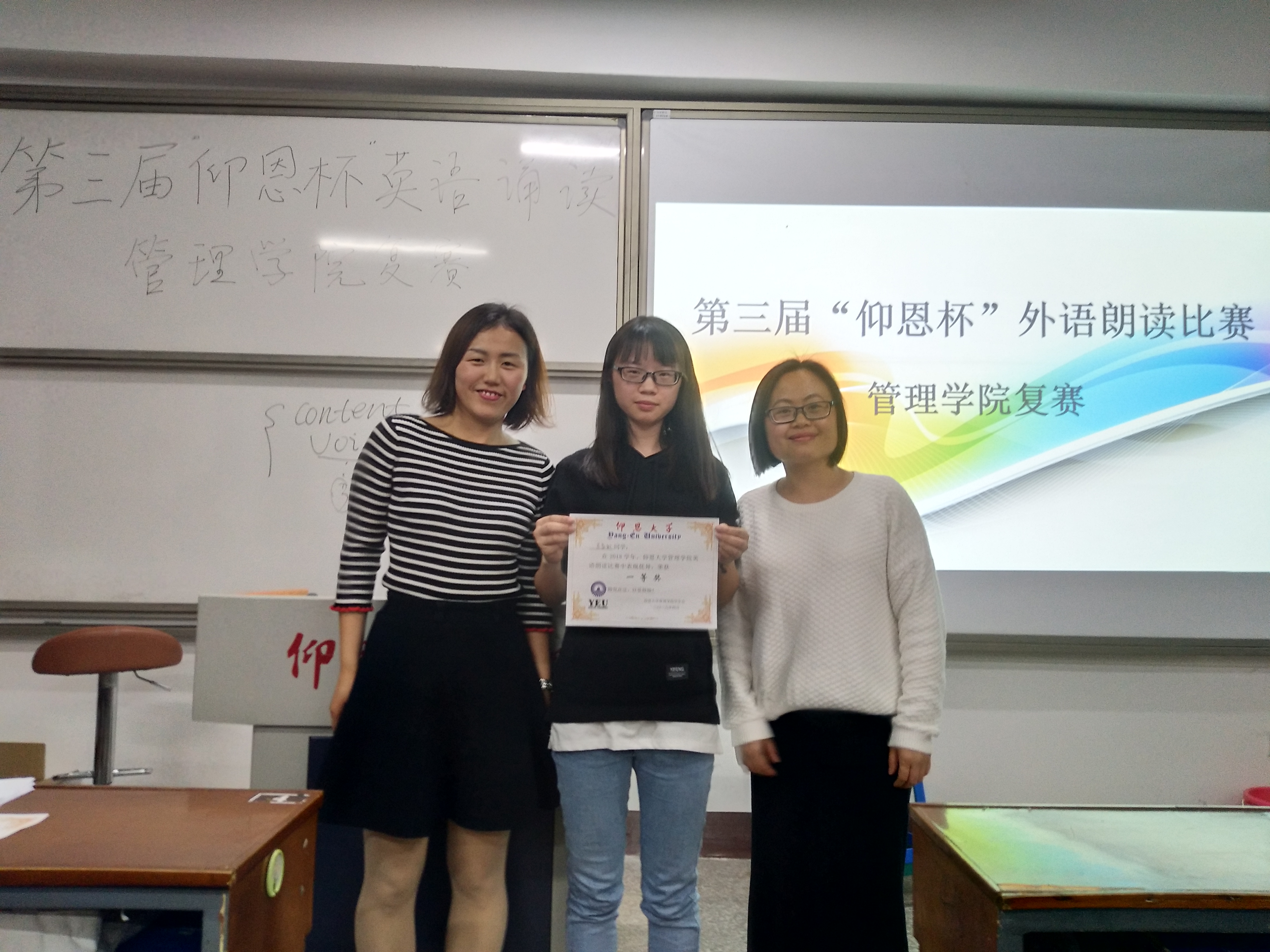 4月1日晚,第三届“仰恩杯”外语诵读比赛Beat365亚洲版官网复赛在Beat365亚洲版官网第一教学区共和楼318成功举办。本次比赛邀请到外国语学院王流新和岳跃金老师担任评委。