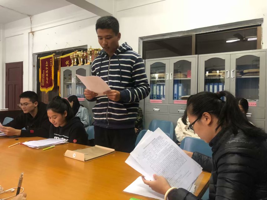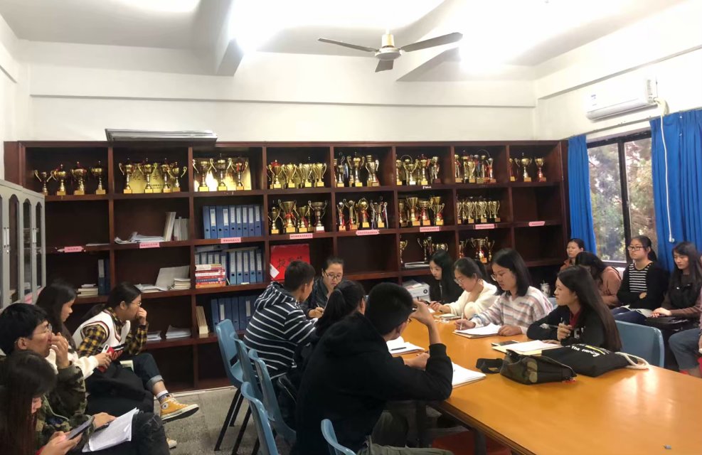 支部书记张梦媚主持会议 本次大会严格按照党组织接收预备党员的程序执行,主要有五项流程。第一,由支部书记张梦媚介绍本次会议的目的、党员到场情况,全体起立并奏唱《国际歌》;第二,拟发展对象宣读入党志愿书;第三,入党介绍人及群众代表对拟发展对象进行全面评价,拟发展对象对评价的态度以及提出改善措施;第四,由全体正式党员以举手方式进行表决,陈家伟、林佳佳、黄艺先等5位拟发展对象均全票通过,顺利成为中共预备党员;第五,由张梦媚老师作总结,她希望预备党员应该严格要求自己,积极参加党的组织生活,坚决执行党的决议,按时交纳党费,并对成功接收为预备党员同志表示祝贺。