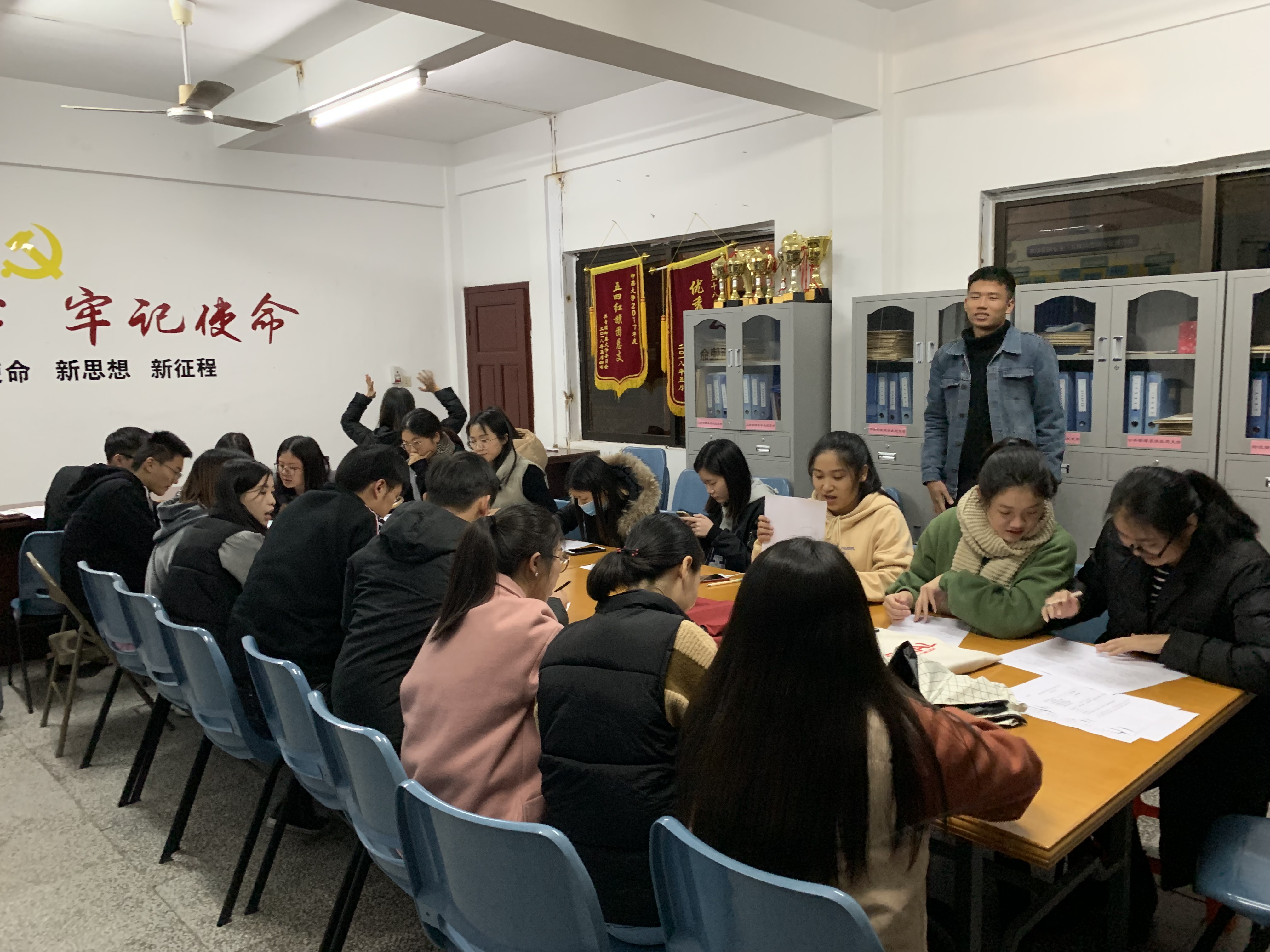 组织生活会现场 大会的主要内容是批评与自我批评以及对正式党员和预备党员进行民主评议。会上,张梦媚老师对这一段时间的支部工作做出了评价,提及在工作中党员不能松懈,更要在思想上跟上党的发展方向。各位预备党员和正式党员按照顺序在会上指出自己近段时间的不足,并对自己的行为进行批评。随后,预备党员和正式党员开始填写“Beat365亚洲版官网党员民主评议情况登记表”,在填写自我评定方面,党员同志要对自己在2018年度的六大方面:政治思想、工作作风、遵守纪律、履行职责、发挥作用、道德品质做出评价。紧接着,民主评议党员,进行综合评定等次,统计得票数情况。