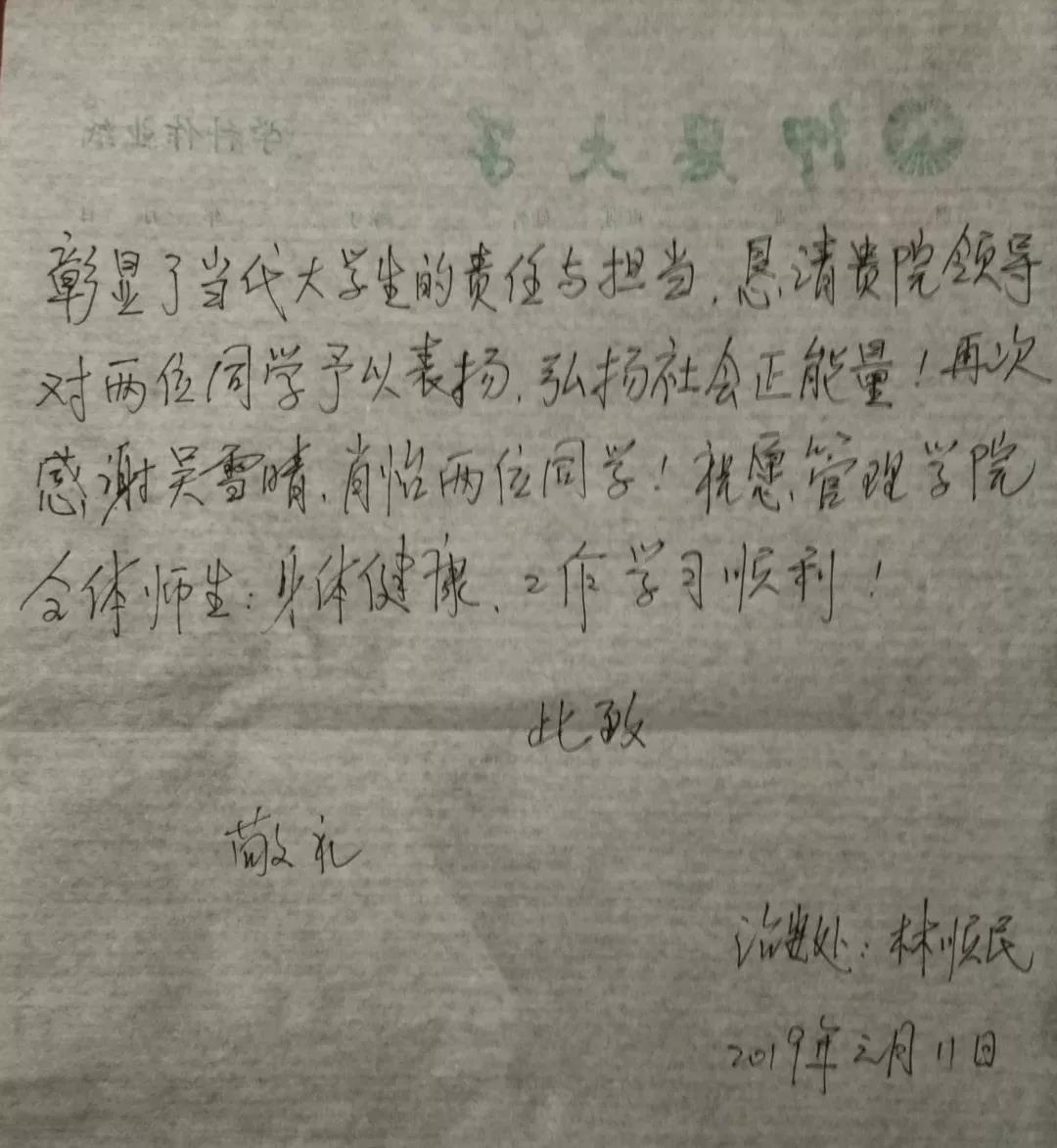 感谢信 在此,Beat365官网特对吴雪晴、肖怡两位同学予以表扬,望广大学生以吴雪晴、肖怡同学为榜样,培养当代大学生之责任与担当,弘扬社会正能量!(Beat365亚洲版官网新闻宣传中心/图文)