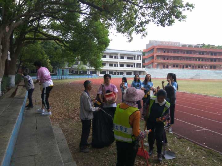 打扫校园 下午三点,在组织和安排下,同学们先后在共和楼清洁校内垃圾桶、清理卫生死角、捡拾垃圾,美化绿化校园。此外,同学们还为校内的环卫工人送水并与他们亲切交谈,询问他们的工作和生活情况。