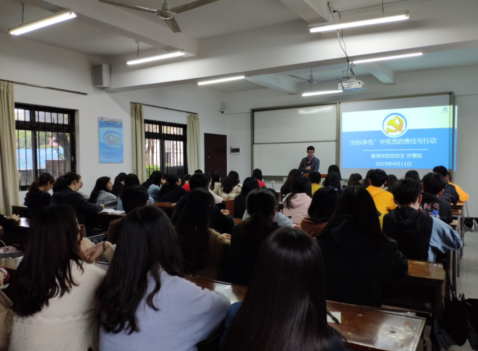 学院党总支书记许惠铭讲党课 同时,许惠铭以“对标争先中党员的责任与行动”为主题,为全体师生党员上了一堂内涵丰富而又深刻生动的党课。此次党课重点围绕以下四个方面的内容展开:一、什么是“对标争先”;二、什么是“十百千万”工程;三、“对标争先”对党支部建设的要求;四、“对标争先”中党员的责任与行动。