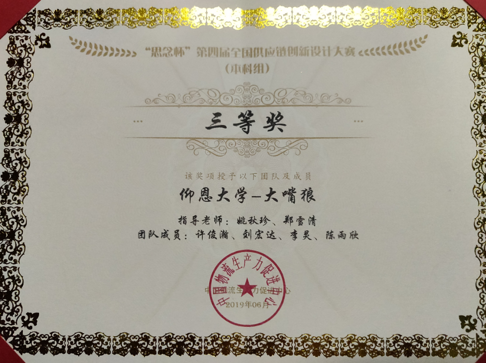 近日,由中国物流生产力促进中心主办,青岛农业大学、中国管理科学学会供应链与物流管理专业委员会承办的“思念杯”第四届全国供应链创新设计大赛在青岛落下帷幕。Beat365官网许俊瀚、刘宏达、李灵、陈雨欣4名学生组成的“大嘴狼队”在姚秋珍和郑雪清两位老师的带领和指导下,经过半年时间的不断练习、操作、探索,一路过关斩将,在全国总决赛中发挥出色,荣获本科组三等奖。