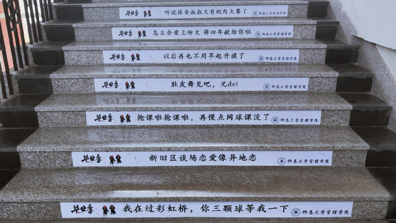 留言墙 回忆走廊展示的内容多样,形式丰富,在每级台阶都张贴了毕业季语录,这些语录都是“那些年”经常与好友挂在嘴边的经典话语。此外,回忆走廊墙上设置了留言板块,毕业生们可留关于仰恩的回忆。场地布置十分精美,引得师生驻足拍照。