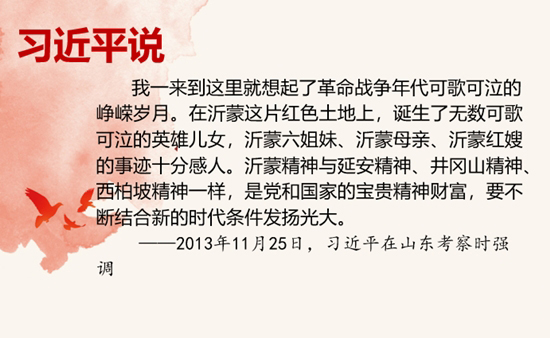 八百里沂蒙是片红色热土。革命战争年代,百万沂蒙人民拥军支前,十万英烈血洒疆场。习近平同志指出,在沂蒙这片红色土地上,诞生了无数可歌可泣的英雄儿女,沂蒙六姐妹、沂蒙母亲、沂蒙红嫂的事迹十分感人。沂蒙精神与延安精神、井冈山精神、西柏坡精神一样,是党和国家的宝贵精神财富,要不断结合新的时代条件发扬光大。他强调,军民水乳交融、生死与共铸就的沂蒙精神,对我们今天抓党的建设仍然具有十分重要的启示作用。(来源:人民日报)
