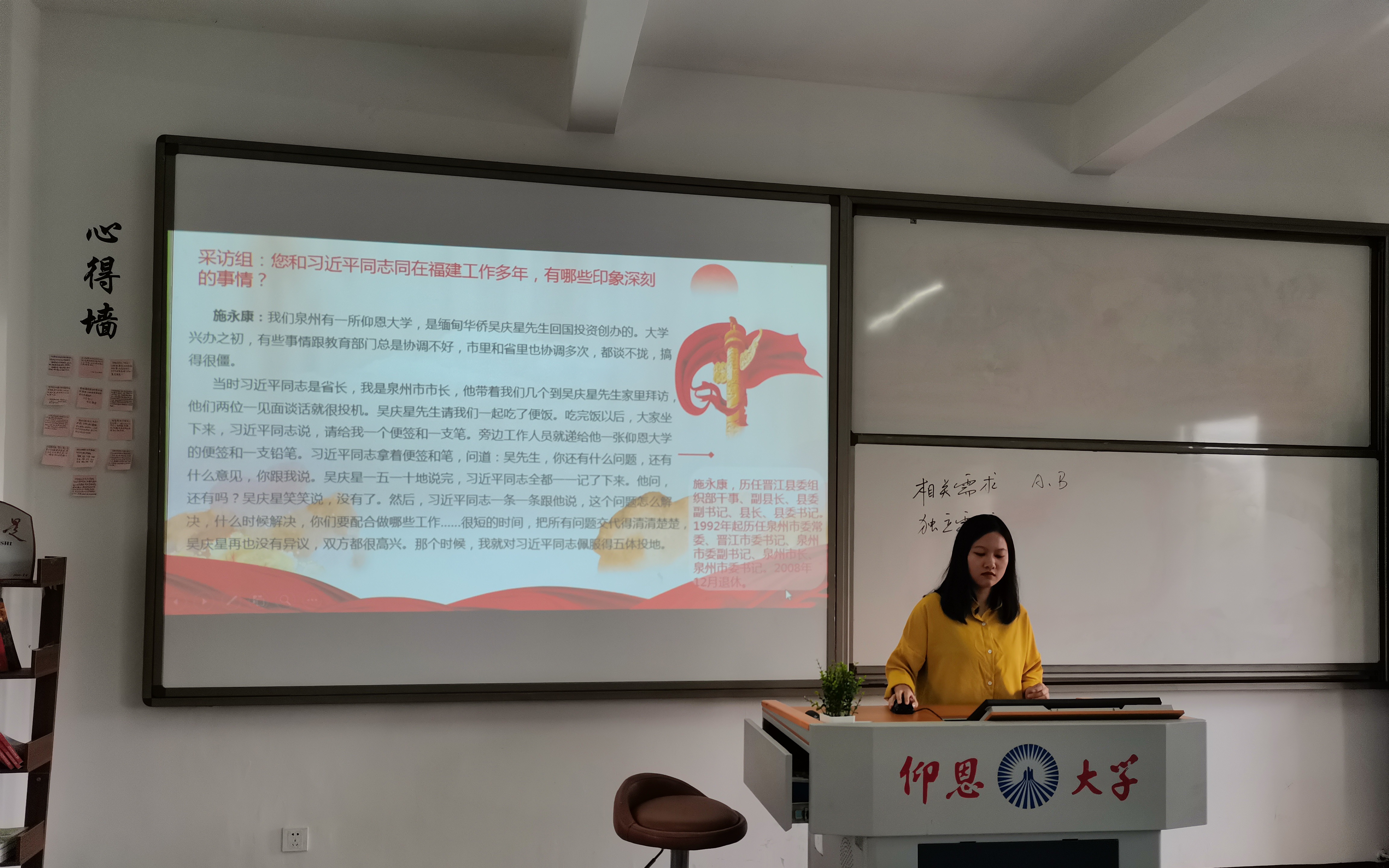 蔡鸿婷同志以“向总书记学习,做求真务实的践行者”为题,为支部同志们分享了晋江经验。作为一名大学生,要深入学习贯彻总书记的工作态度及讲话精神,以实际行动努力做好本职工作,在日常生活中尊师敬友,向他人谦虚学习。相信在习近平总书记的领导下,国家会越来越繁荣富强,中华民族的伟大复兴一定会实现。