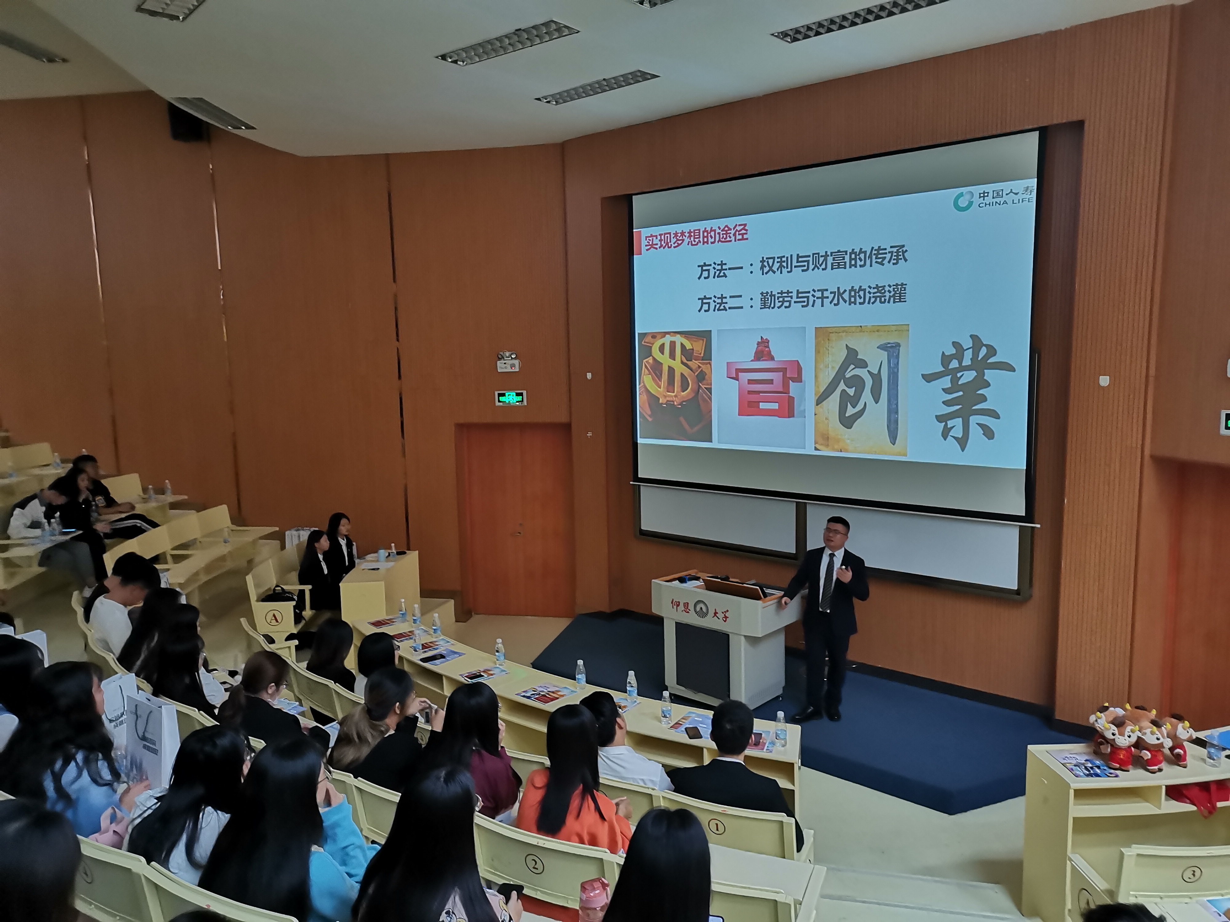 活动伊始 此次招聘宣讲会邀请了中国人寿财产保险股份有限公司晋江支公司朱燕清副总经理和晋江区域许簪波总经理以及赖素蓉部经理等到现场进行宣讲招聘。活动伊始,赖素蓉女士针对中国人寿保险股份有限公司的发展历程以及员工福利等进行相关介绍,并与同学们进行了互动问答。现场氛围融洽轻松,并伴随着热烈的掌声。接下来,许簪波先生讲诉了自己的目标和理想激励着同学们勇敢的追求梦想。答疑解惑环节,同学们积极举手发言,获得了由中国人寿精心准备的小礼品。最后,许簪波先生告诫同学们在未来工作要做到一下几点:1、每天充满积极阳光的心态;2、一定要自主自发的去学习;3、但凡任务下来尽全力去完成。随后,朱燕清讲解了岗位的需求,并用校训勉励同学们学会做人做事。