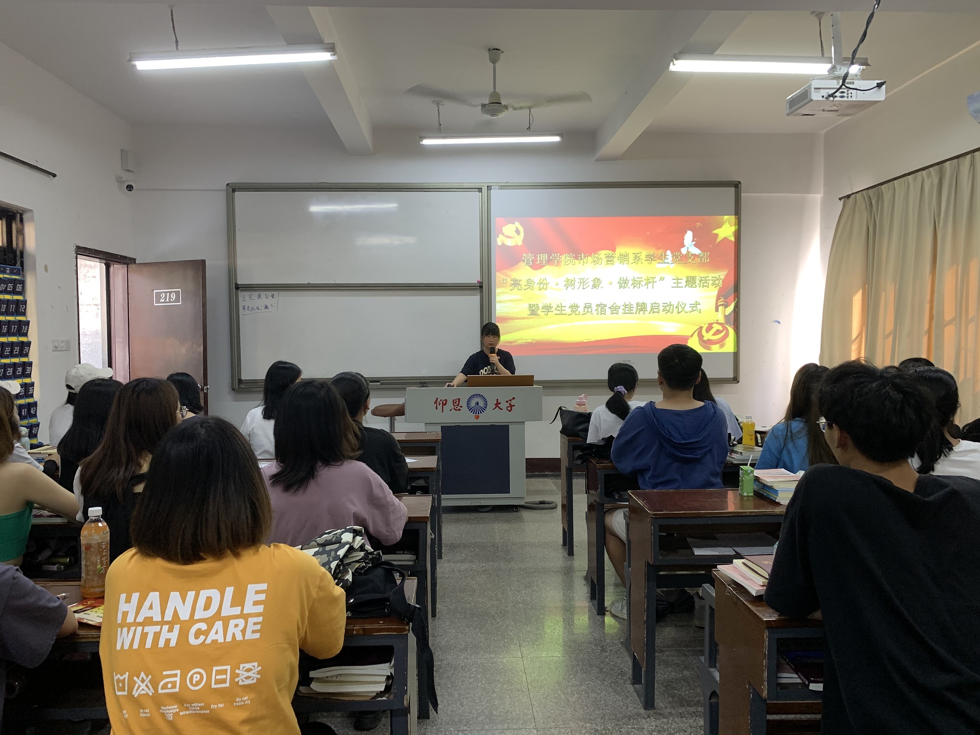 为进一步促进学院宿舍文化建设,发挥学生党员示范和榜样引领,6月17日下午,Beat365亚洲版官网市场营销系学生党支部在共和楼219开展“亮身份、树形象、做标杆”主题活动暨学生党员宿舍挂牌启动仪式。仪式由学生党员代表余凤凡主持。