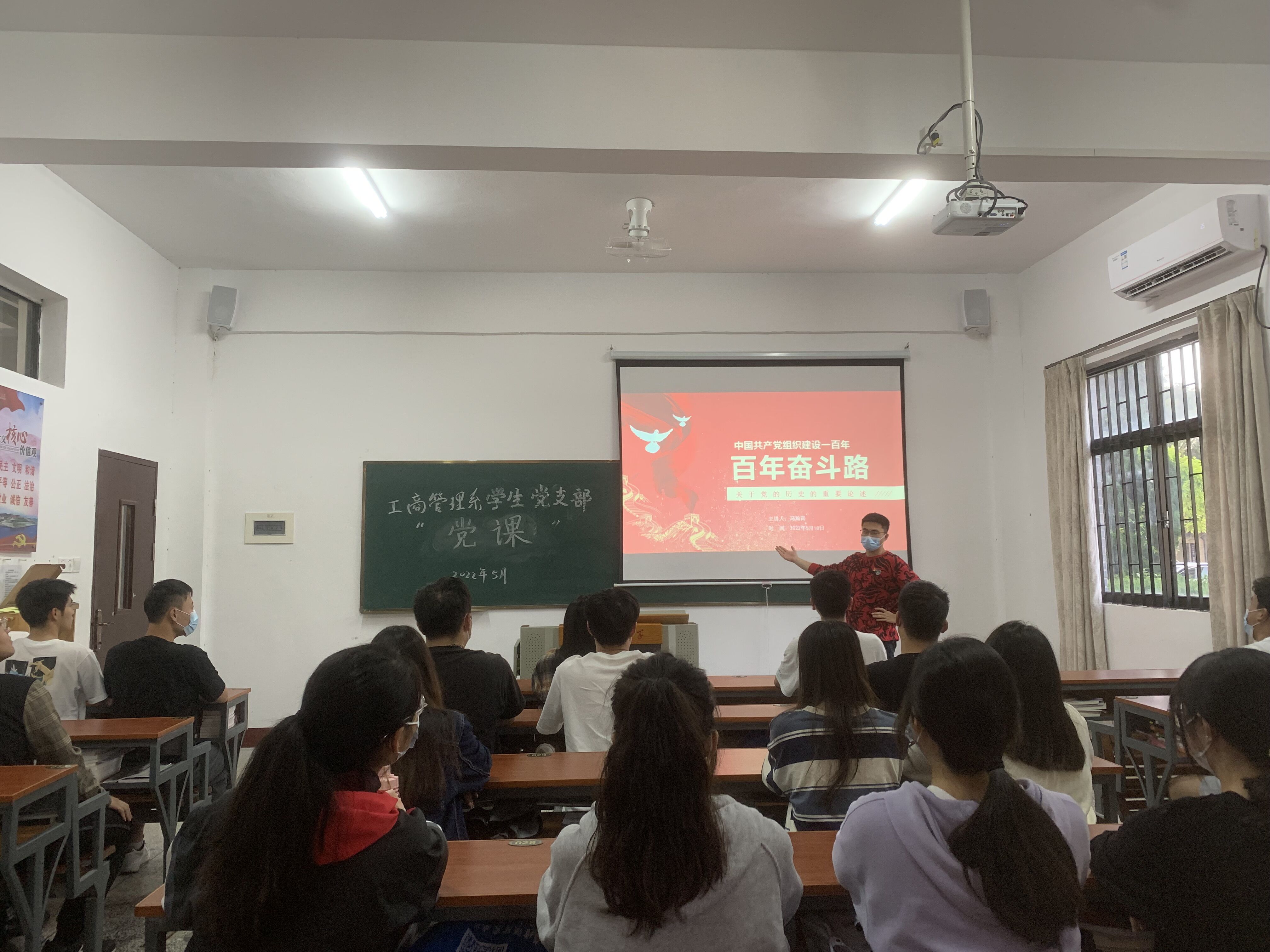 党史是明灯,也是号角。《中国共产党组织建设一百年》作为全体党员干部理论学习的必修课,不断增强学习的系统性、全面性。在学习中汲取信仰力量,学以致用,进一步发挥基层党组织的战斗堡垒作用。2022年5月18日,工商管理系学生党支部于祥贤楼101开展《中国共产党组织建设一百年》支部书记讲党课活动,支部全体党员到会。