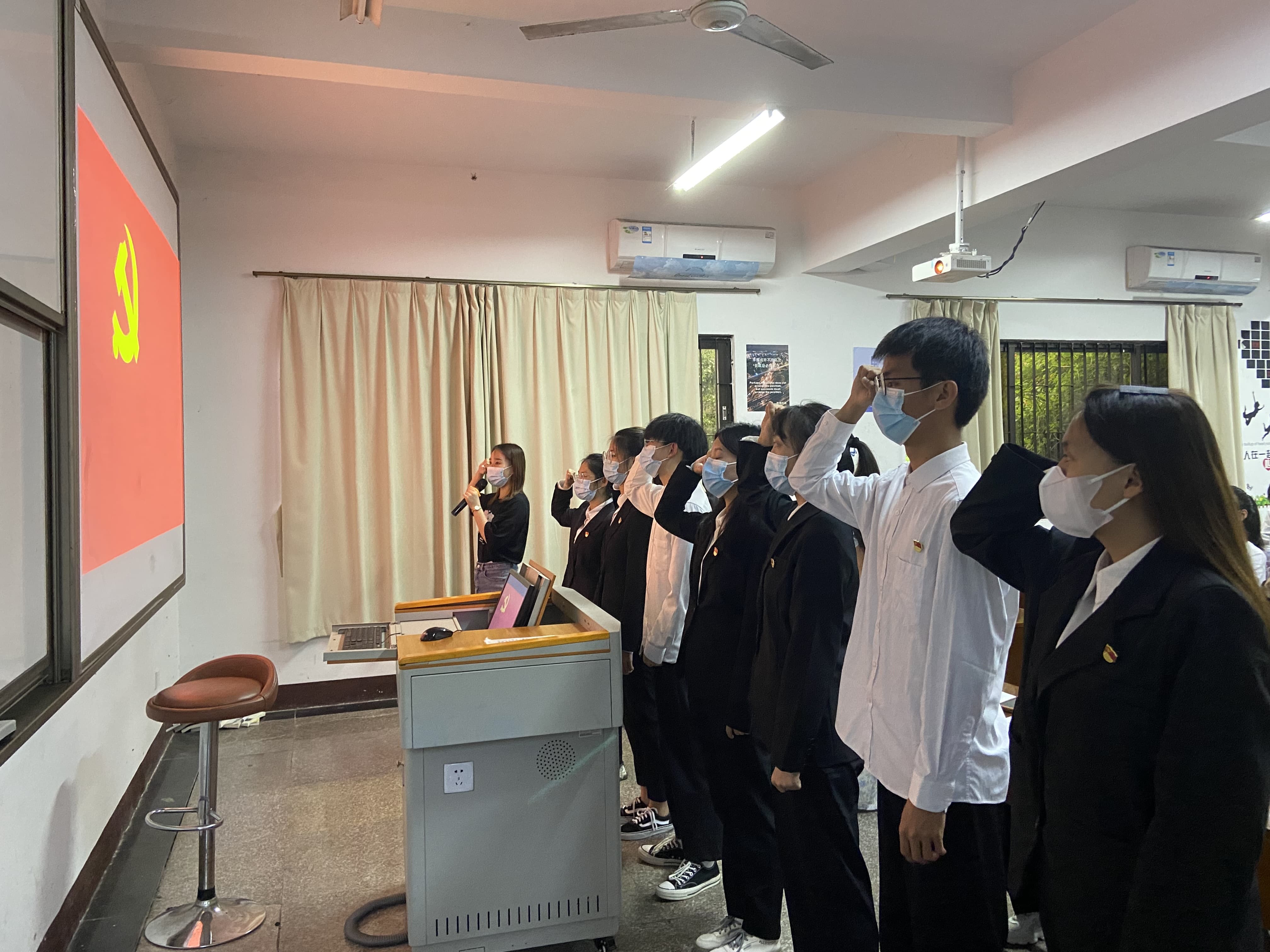 宣誓入党誓词 会议开始,七名拟发展对象依次宣读转预备党员申请书,并汇报为何入党、凭何入党以及入党后怎么做,拟发展对象的群众代表对该发展对象进行优缺点评价,并由拟预备党员表态。接着,根据到会所有具有表决权的正式党员对上述同志的充分讨论和不记名投票结果,温晓霞同志宣读了大会决议,全票通过接受7名同志为预备党员。最后,由正式党员为预备党员佩戴党徽,并由兰燕菲同志带领预备党员宣誓入党誓词。