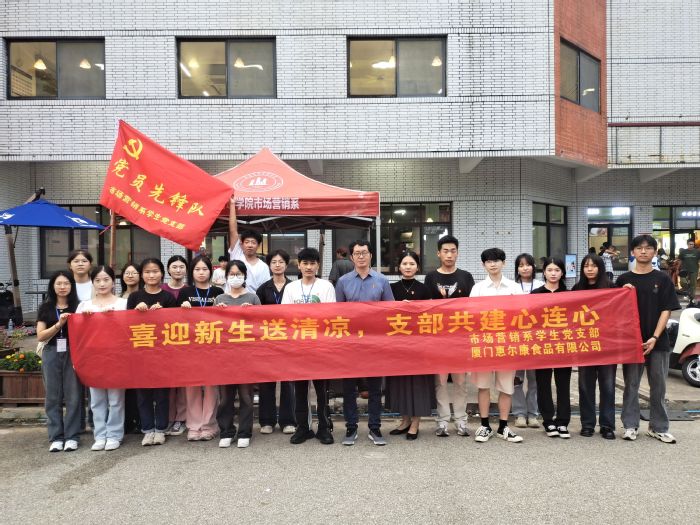 97-8日,市场营销系学生党支部联合厦门惠尔康食品有限公司普照大礼堂门口开展“喜迎新生送清凉,支部共建心连心”党建活动。