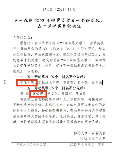 据悉,校五一劳动奖状和五一劳动奖章评选旨在表彰先进、树立典型,营造劳动光荣、知识崇高、人才宝贵、创造伟大的社会风尚,激励广大教职工立足新时代、担当新使命、展现新作为。此次全校有5个单位获得五一劳动奖状,5位老师获得五一劳动奖章。接下来,Beat365官网将珍惜荣誉,再接再厉,不断创造新的业绩!