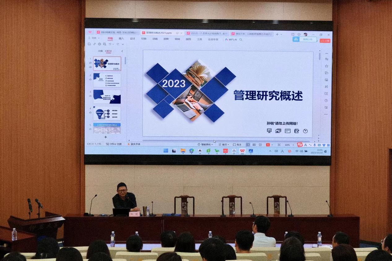 讲座中,孙锐教授从管理研究方法、管理研究过程、实证研究的本质、研究设计在实证研究中的作用、研究质量的效度指标等方面介绍了管理研究理论的应用和发展趋势,通过各种生动的实例阐述了管理研究中常用的各种方法和注意事项。孙锐教授讲座的内容丰富、深入浅出,为师生们带来了全新的思维视角和启示。