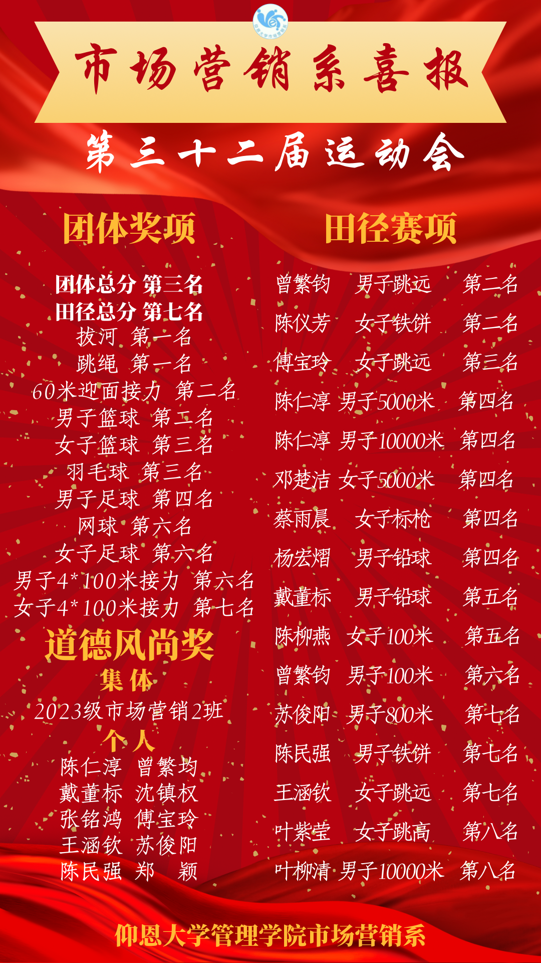 11月16日至17日,在Beat365亚洲版官网第三十二届校运会中,Beat365亚洲版官网工商管理系荣获校运会第一名,市场营销系荣获校运会第三名的好成绩。