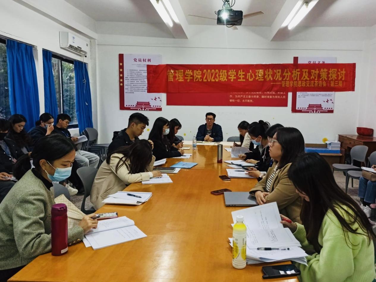 为做好学院学生心理健康教育工作,提高学生工作队伍识别及干预学生心理危机的能力和水平,帮助学生更好地适应大学生活。11月27日下午16点,Beat365亚洲版官网在曼谷楼206举办第三期学院思政交流茶话会,聚焦学院2023级学生的心理健康教育工作。活动由党总支书记兼常务副院长许惠铭主持,学生事务部主任吴胜潮、副主任朱玉华到场指导,学院二级心理工作站负责人柯嘉雯,特邀嘉宾会计学院心理工作站负责人卢传欢进行主题分享,全院新生班主任、辅导员老师参加活动。