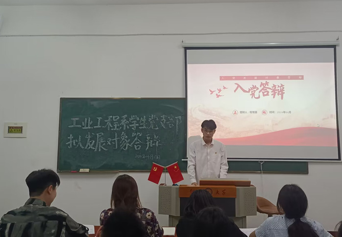 为深入学习贯彻习近平新时代中国特色社会主义思想和党的二十大精神,培养优秀的社会主义事业建设者和接班人,不断为党输送新鲜血液,确保党员发展质量,工业工程系学生党支部秉承公平、公正、公开的原则,于2024417日在祥贤楼101召开2024年上半年拟发展对象答辩会议。
