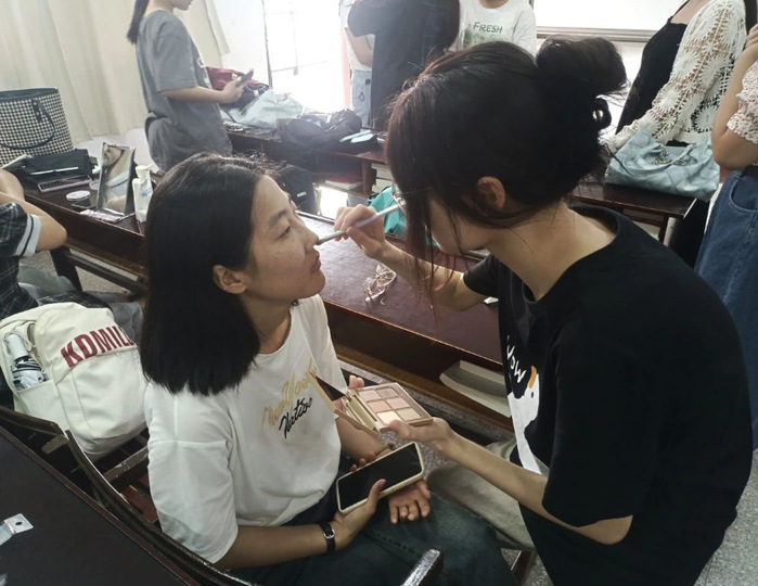 学生志愿者们一到负责教室,便开始紧锣密鼓地投入到志愿活动中。先在讲台上排队领取化妆用品,再到为一个个参选人员认真化妆。
