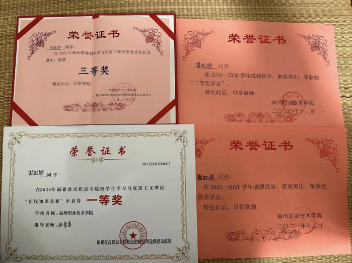在学习上,我从进校以来学习一直未松懈,有明确的学习目的和积极的学习态度,努力学好课程内容和专业知识,深知只有学好专业知识才能具备扎实的专业功底。我的学习成绩一直保持中上水平,理论和实践是不可分的,要时刻以实际运用作为最终的学习目标,在实践中学习,我积极学习课外知识,参与暑假社会实践,以拓宽自己的知识面,提高自己的个人素养、职业素养,努力让自己全面发展。在校期间获得福建省高职高专院校学生学习马克思主义理论“在线知识竞赛”一等奖;2020-2021学年获得福州职业技术学院三等奖学金。