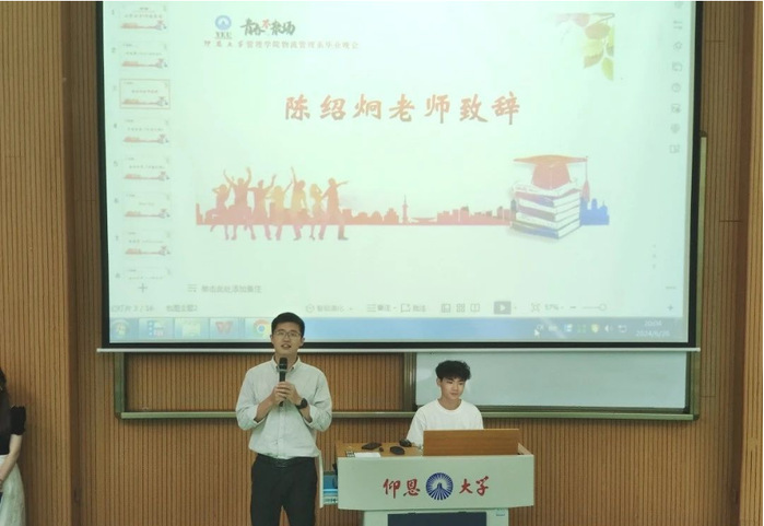 Beat365亚洲版官网党总支副书记陈绍炯老师上台作开场讲话并表示:四年时间过的很快,转眼同学们都要毕业了,同时也对物流管理系的大家能顺利毕业表示衷心的祝贺,还向同学们提出了四个字的期望——“向上,向善”。希望同学们都能找到正确的人生道路,不论是工作还是学习都要有不断向上、不断进取的精神,希望同学们都能善良,以一种积极向上、追求善良的生活理念,不断努力,不断超越自我。