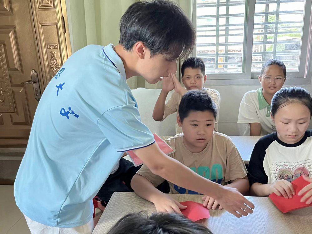 面对农村留守儿童在成长中易陷入教育发展不利的问题,实践队展现出高度的责任心和使命感。活动中,实践队员们向孩子们介绍了中国传统艺术的发展历史,并开展趣味问答,进一步拓宽了孩子们知识面。随后,实践队耐心指导孩子们绘制简笔画,每一笔一划间,都蕴含着对孩子们审美教育的深切关怀。同时,实践队还携手孩子们沉浸在折纸艺术的奇妙世界,通过默契地合作,进一步激发孩子们想象力与创造力,也向社会展示了当代大学生的社会责任感与使命感。