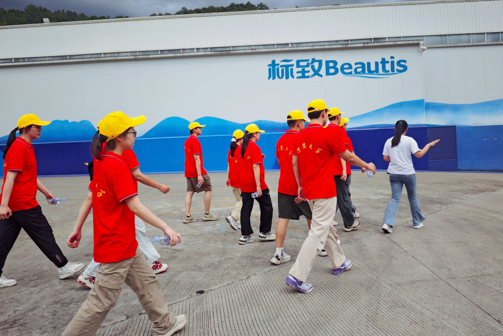 到达江山标致水厂后,先观看了标致公司宣传视频,在讲解员的介绍下,实践队首先来到制水车间,实地参观每一瓶水从罐装到包装的过程。在这里,实践队目睹了如何快速高效地将杂质逐一剔除的先进过滤技术,这项技术能确保每一滴水都达到饮用标准。从沉淀池到过滤池,每一个环节都严谨有序地进行着。从清洗到消毒,从罐装到封盖,再到贴标,全自动一体化的生产线,确保每一滴水质的安全。