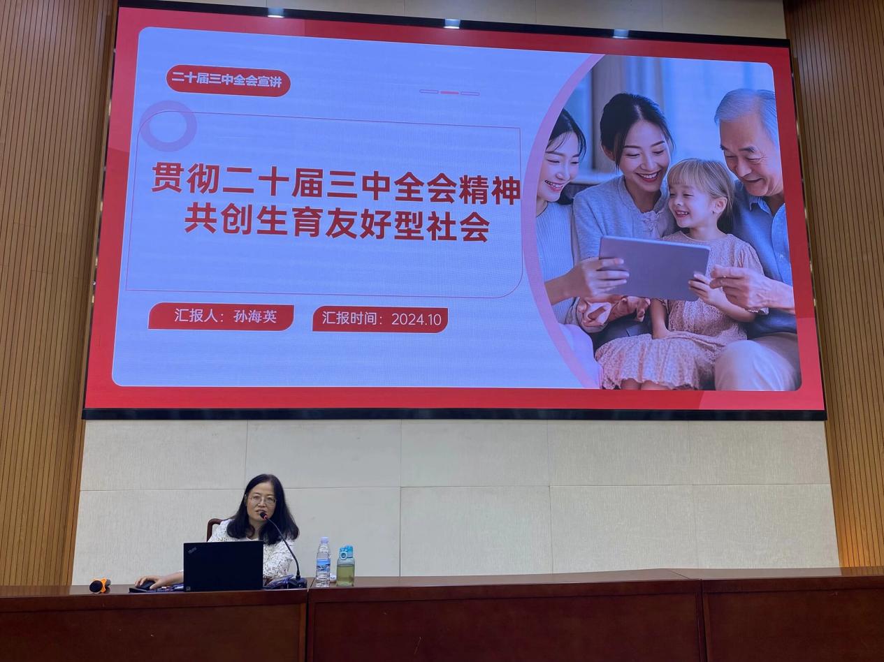 宣讲会上,孙海英副教授概述了二十届三中全会的重要性,指出会议提出的决策和部署为未来发展指明了方向,特别是构建生育友好型社会的提出,体现了国家对人口问题的高度重视。她阐述了构建生育友好型社会的必要性,指出此举有利于优化人口结构,促进可持续发展,实现人民对美好生活的向往。孙海英副教授还提出了共创生育友好型社会的路径与策略,建议政府完善生育政策,提高保障水平,社会各界积极参与。孙海英副教授的讲解深入浅出,既有理论高度又贴近实际,赢得与会师生阵阵掌声。大家表示,通过此次宣讲会,对二十届三中全会精神及构建生育友好型社会的必要性和路径有了更清晰的认识。