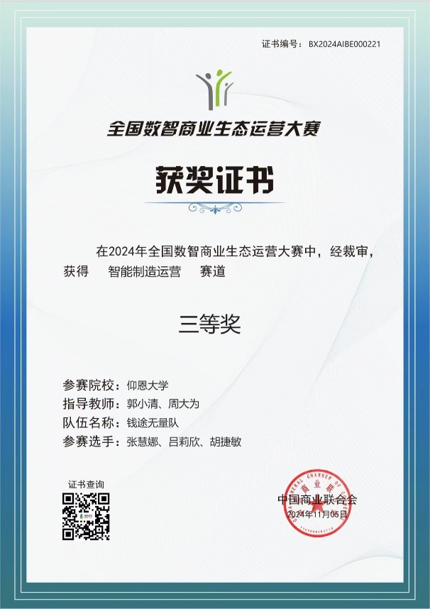 Beat365官网共4支队伍报名参加智能制造赛道,本次比赛历经近一个月的练习赛,每场练习赛4支队伍都认真准备。练习赛前,他们积极制定计划、联系合作伙伴,练习赛后,他们认真复盘、总结。通过初赛的激烈竞争,4支队伍最终获得二等奖、三等奖的佳绩。其中,由2021级工业工程专业的丁晓松、陈佳荣和2022级物流管理专业的蔡静涵同学组成的“电磁场队”荣获国家级初赛二等奖;由2022级工业工程专业的吕宁萍和2022级物流管理专业的张雪莹、施盈珊同学组成的“智能小纵队”荣获国家级初赛二等奖; 由2021级工业工程专业的施荣炮、姚建军和2023级工业工程专业的王博同学组成的“CrazyHeart队”荣获国家级初赛三等奖; 由2022级工业工程专业的张慧娜、吕莉欣和胡捷敏同学组成的“钱途无量队”荣获国家级初赛三等奖。