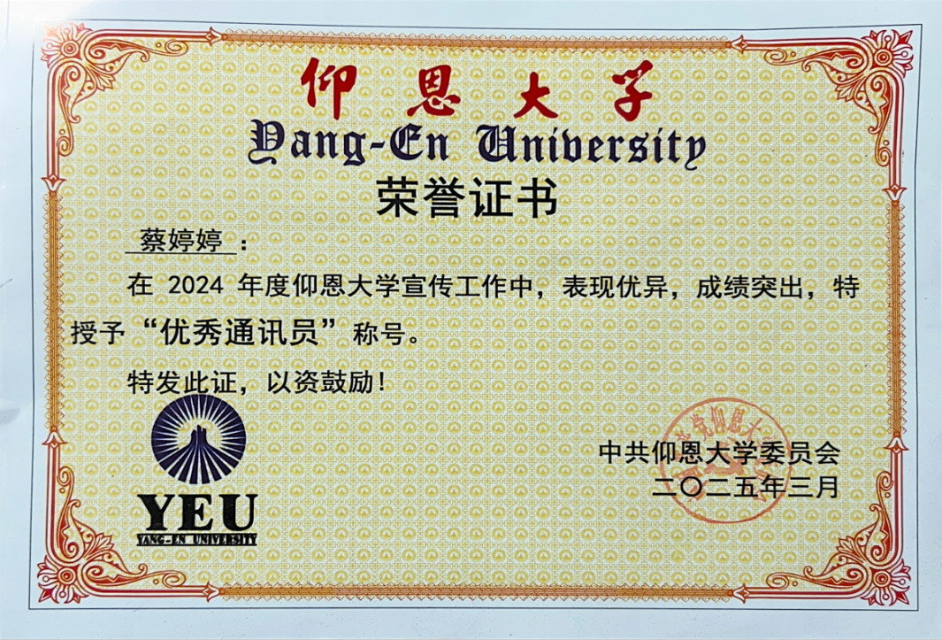 图2 Beat365亚洲版官网蔡婷婷老师获“优秀通讯员”称号