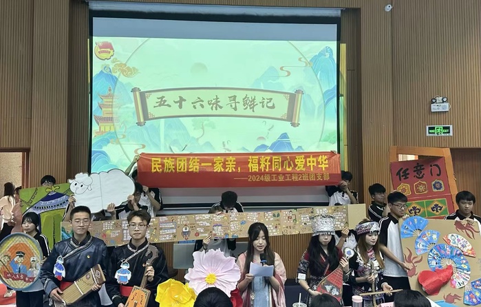 比赛过程中,工业工程系各班团支部紧紧围绕“民族团结一家亲,福籽同心爱中华”的活动主题,以新颖独特的汇报形式并结合富有民族团结色彩的道具充分展现各班团支部的青春风采与奇妙巧思。2024级工业工程2班团支部采用美食节目情景剧的形式进行汇报,将各民族独特的饮食文化、风土人情巧妙融入剧情,生动展现各民族的特色与魅力,同学们生动的表演赢得了现场观众的阵阵喝彩,最终斩获团日活动院赛一等奖。2024级工业工程1班团支部则独具匠心,运用剪纸、海报等艺术形式,以细腻的线条、绚丽的色彩展现各民族的团结之美,最终荣获院赛优秀奖。