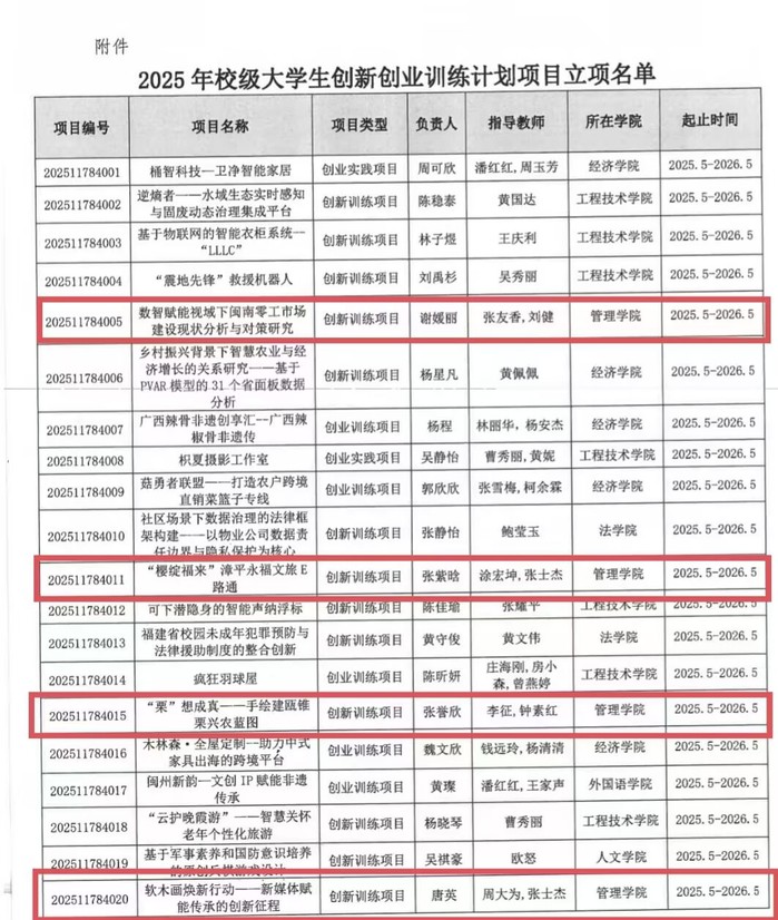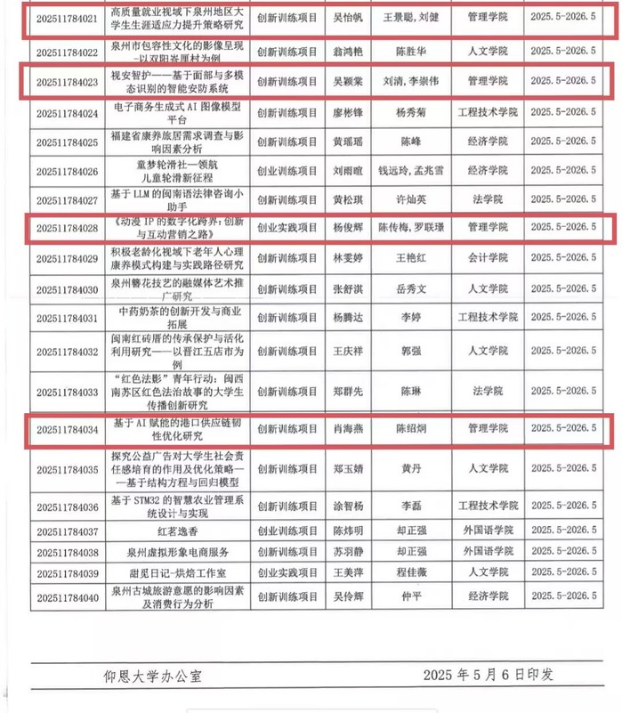 近日,根据《关于公布2025年校级大学生创新创业训练计划项目立项名单的通知》(仰大教〔2025〕21号),Beat365官网共立项大学生创新创业训练计划项目8项。