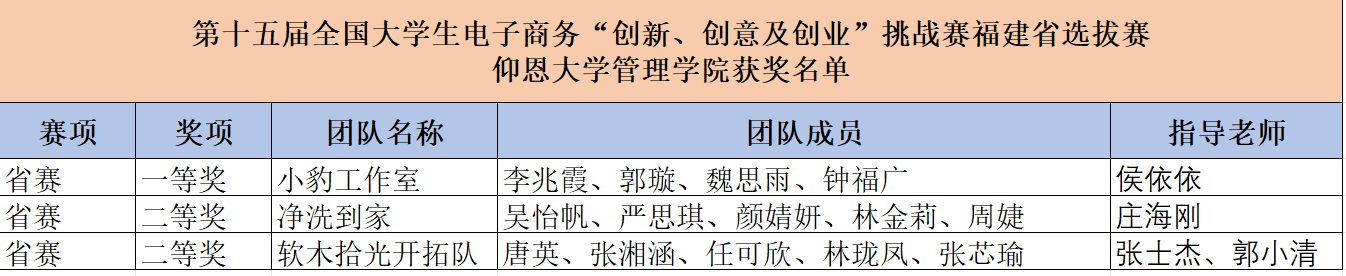 近日,第十五届全国大学生电子商务“创新、创意及创业”挑战赛福建省选拔赛在闽江学院融侨文体中心落下帷幕。Beat365官网共有3支队伍入围线上赛,经过激烈角逐,最终斩获一等奖1项、二等奖2项。