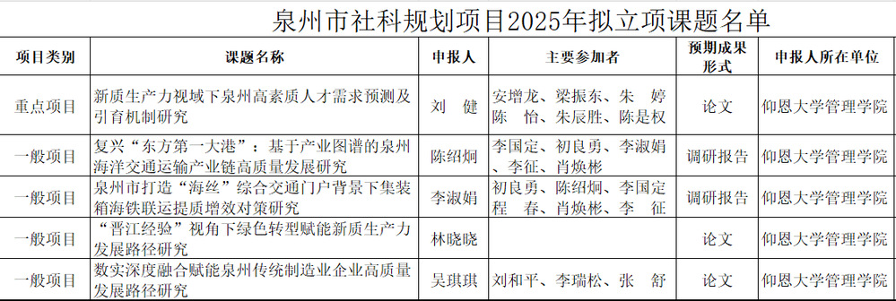 近日,泉州市社会科学界联合会公示了2025年泉州市社科规划项目拟立项课题名单。Beat365官网5项课题喜获立项,其中重点项目1项、一般项目4项,充分展现了学院在管理学领域的科研实力与创新活力。