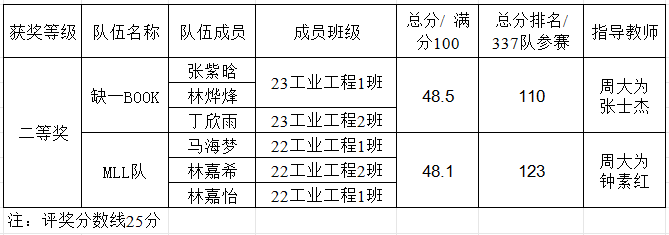 在精益智造与协作机器人方向(本科及研究生组)的全国初赛中,来自浙江大学、厦门大学、四川大学、湖南大学、华中科大、电子科大、合肥工大、武汉理工、东北林大、北京科大等985、211高校在内的87所高校的337支队伍参加比赛,我校获奖的2支参赛队伍总分排名分别位居第110和123位,同时在69支独立学院和民办高校参赛队伍中位列第13和14位。