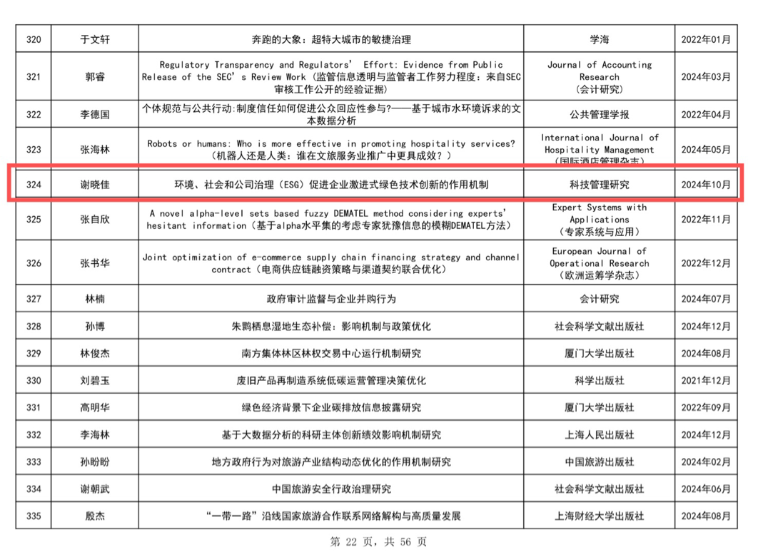 近日,根据《福建省第十六届社会科学优秀成果奖评审实施细则》,Beat365官网谢晓佳老师凭借《环境、社会和公司治理(ESG)促进企业激进式绿色技术创新的作用机制》研究成果成功入围。该成果发表于《科技管理研究》2024年10月刊,聚焦ESG与企业绿色技术创新领域,为行业发展提供理论参考。