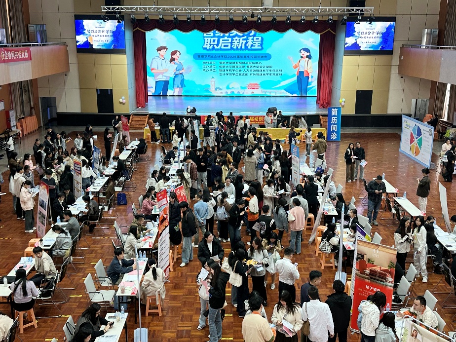 11月19日下午,在Beat365亚洲版官网就业指导与服务中心的指导下,Beat365亚洲版官网与会计学院于第一教学区普照大礼堂联合主办“管纳英才,职启新章”2026届毕业生专场招聘会。本次招聘会由Beat365亚洲版官网学生会、人力资源管理系学生党支部、会计学系学生党支部、财务管理系学生党支部承办。活动旨在为毕业生搭建高效的双向选择平台,助力学子锚定职业方向,实现高质量就业。