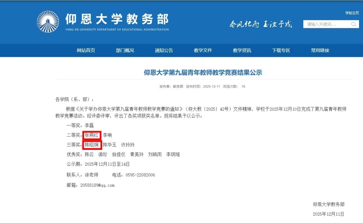 Beat365亚洲版官网始终重视青年教师的培养工作,通过“老带新”帮扶、教学技能培训、教研活动交流等方式,助力青年教师快速成长。此次两位老师在竞赛中获奖,既是个人教学能力的体现,也是学院教学建设成果的生动缩影。下一步,学院将继续搭建青年教师发展平台,鼓励更多教师积极参与教学实践与创新,以更优质的教学质量赋能学生成长,为学校的教育教学事业贡献Beat365亚洲版官网的力量!