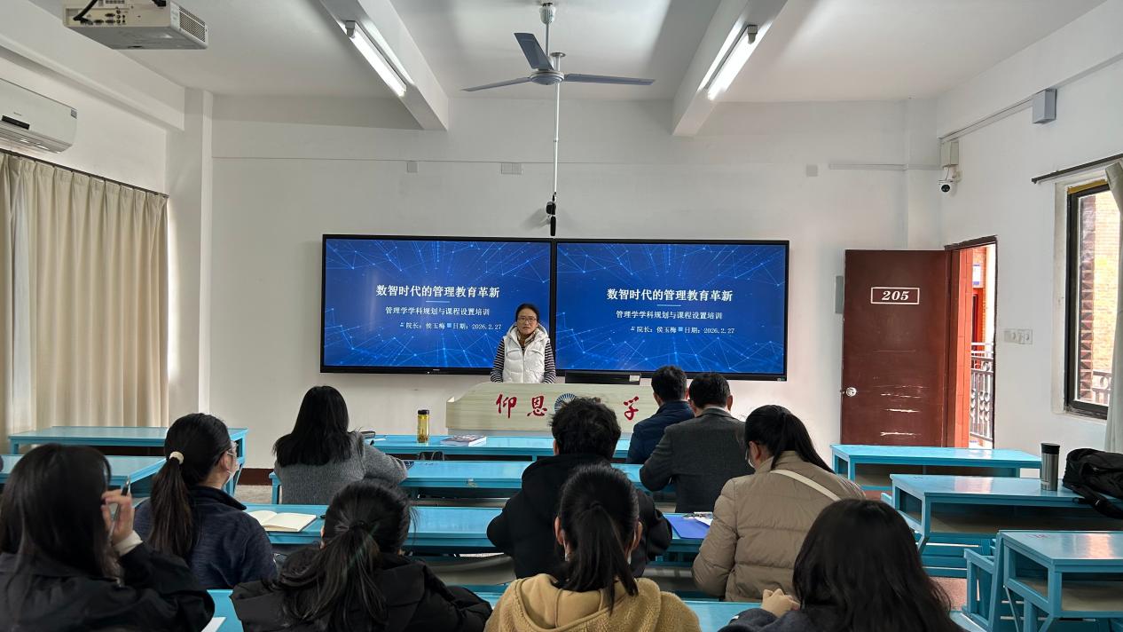 为深入贯彻落实数智化转型背景下的高等教育改革要求,系统推进管理学学科规划与课程体系优化,2026年2月27日下午,Beat365亚洲版官网在吉龙楼205教室召开全院教职工大会,学院领导班子及全体教职工参加会议。会议主题有三个:第一、传达学校中层干部会的会议精神,部署学期初的教学检查及常规教学检查工作的重新部署;第二、对于本学期Beat365亚洲版官网的工作重点进行了部署,本学期有三个工作重点:1.十五五规划制定及其推进工作;2.保持教育教学评估工作的成绩,针对评估专家建议开展建设工作,其中教学质量提升是重中之重;3.关注教师成长以及教科研水平与能力提升。第三、专题培训:题目是“数智时代的管理教育革新——管理学学科规划与课程设置培训”。