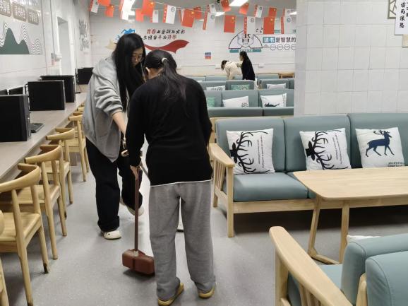 活动开展前,支部成员们结合书院实际环境划分清洁责任区域,明确各区域的清扫标准、任务要求及劳动过程中的安全注意事项,确保清扫工作有序、高效推进。部署结束后,成员们拿着清洁工具,以饱满的热情投入到清扫工作中。大家分工协作、相互配合,有的仔细擦拭书院走廊的门窗、扶手与公共桌椅,有的认真清扫地面灰尘、杂物,细致拖拭顽固污渍,有的耐心整理公共区域的闲置物品,对墙角、储物角落等卫生死角进行重点清理,做到不留盲区、不漏细节。经过一番辛勤劳作,书院的公共区域环境焕然一新,每一处角落都变得干净整洁。
