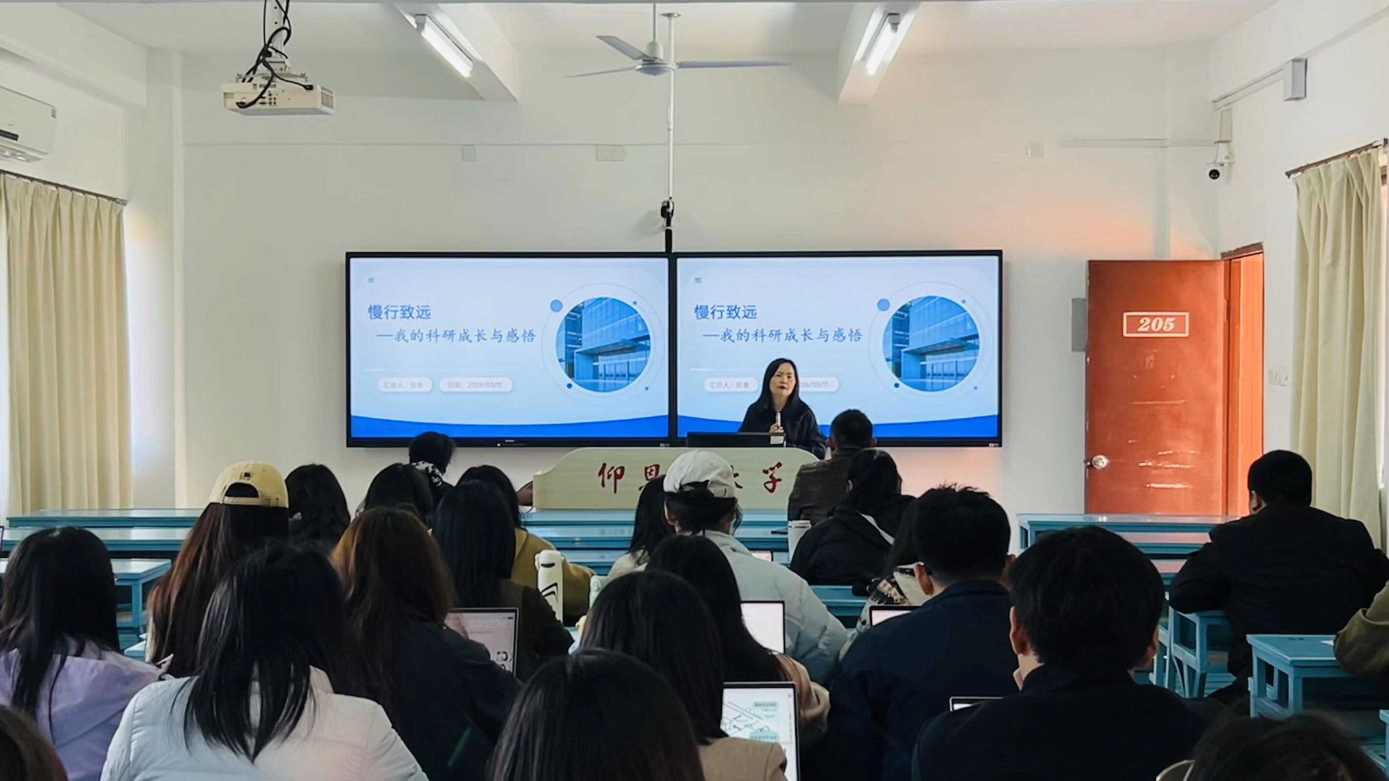 分享环节,四位教师结合自身科研实践各展所长。程春教授作《慢行致远—我的科研成长与感悟》分享,结合二十年从助教到教授的科研历程,梳理扎根、积累、深耕、拓展四个阶段的探索经验,解读科研长期主义内涵。她提出科研需接纳平庸、保持学术好奇心与热爱,以平和心态应对低谷,其“慢是为了以后更快”的感悟引发广泛共鸣。