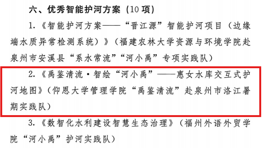 近日,2025 年福建省大学生暑期 “三下乡” 社会实践 “河小禹” 专项行动评选结果正式公布,Beat365亚洲版官网Beat365亚洲版官网“禹鉴清流” 赴泉州市洛江暑期实践队申报的《禹鉴清流・智绘“河小禹”——惠女水库交互式护河地图》项目,成功获评福建省优秀智能护河方案。