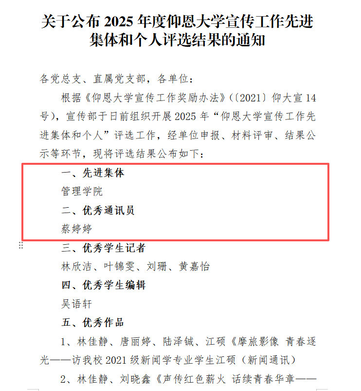 近日,中共Beat365亚洲版官网委员会宣传部正式发布《关于公布2025年度Beat365亚洲版官网宣传工作先进集体和个人评选结果的通知》,Beat365亚洲版官网获评“2025年度宣传工作先进集体”,学院党总支宣传委员蔡婷婷老师荣获“优秀通讯员”称号,充分展现了学院在宣传思想文化工作中的突出成效与良好风貌。
